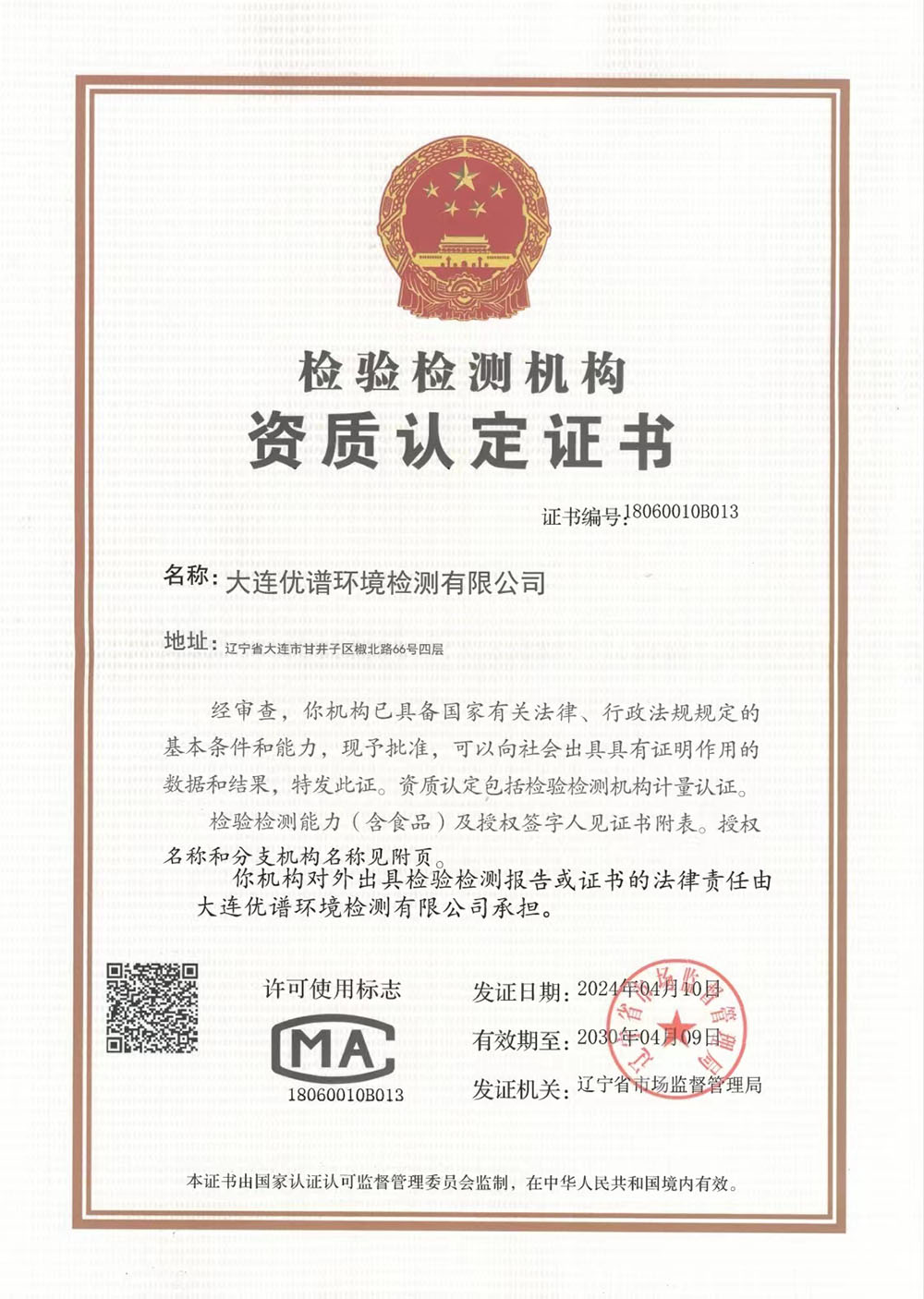 大連優(yōu)譜環(huán)境檢測有限公司是中國領(lǐng)先的第三方權(quán)威檢測機(jī)構(gòu)已取得CMA中國計(jì)量認(rèn)證資質(zhì)認(rèn)定,遼寧省生態(tài)環(huán)境廳備案,具備向社會出具公正數(shù)據(jù)的資格。擁有國際先進(jìn)的檢測分析儀器和經(jīng)驗(yàn)豐富的檢測化驗(yàn)工程師團(tuán)隊(duì)。